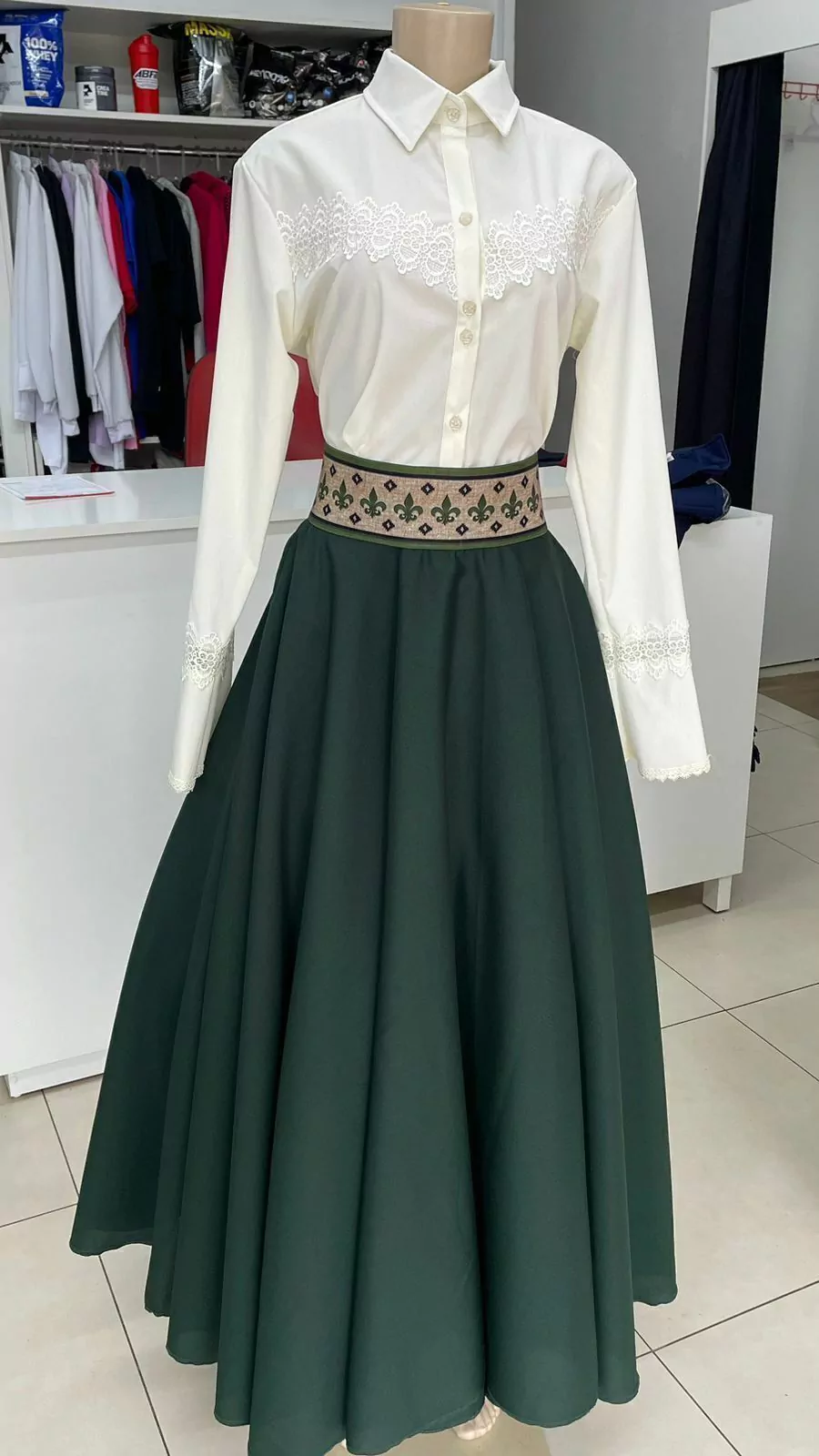 Saia confeccionada em Oxford com faixa pampa elástica que se molda perfeitamente na cintura.