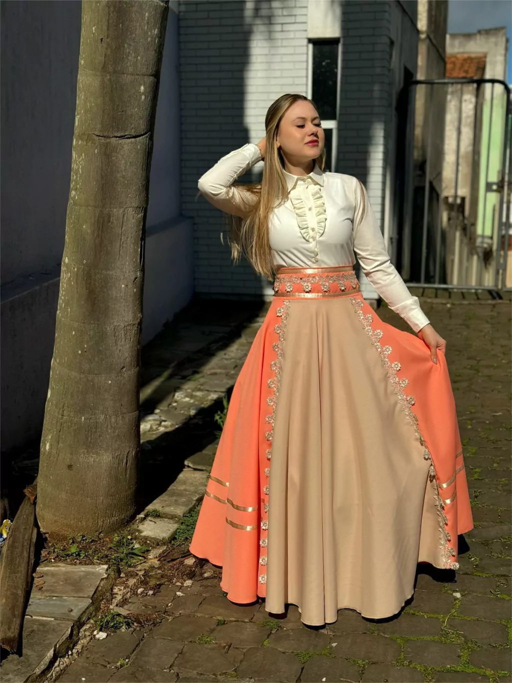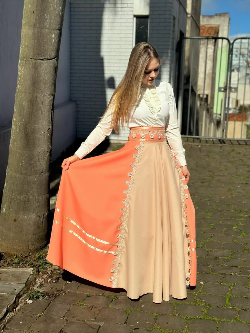 Saia confeccionada em Oxford com duas cores, detalhes em renda e babado.