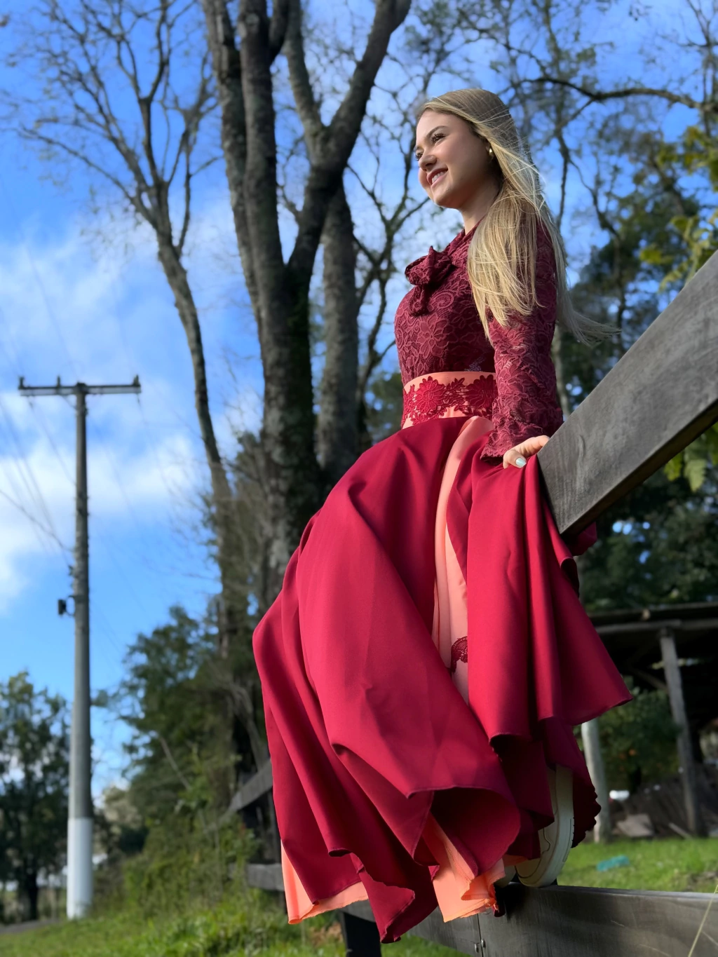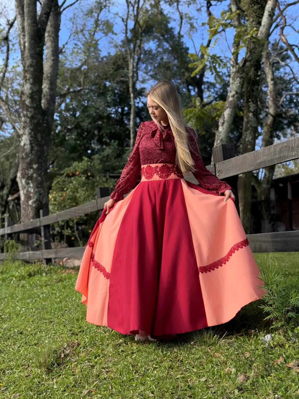 Saia confeccionada em Oxford com duas cores, detalhes em renda e babado.