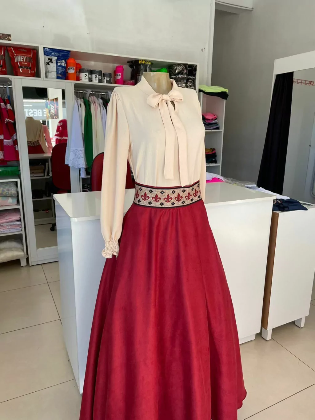Saia confeccionada em Sued bordô com faixa pampa elástica que se molda perfeitamente na cintura.
