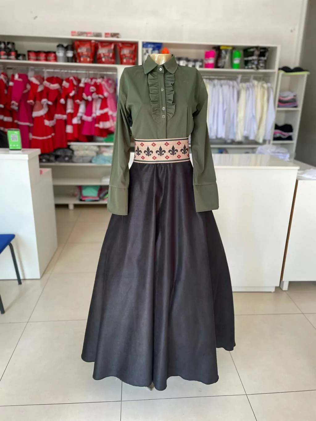 Saia confeccionada em Sued com faixa pampa elástica que se molda perfeitamente na cintura.