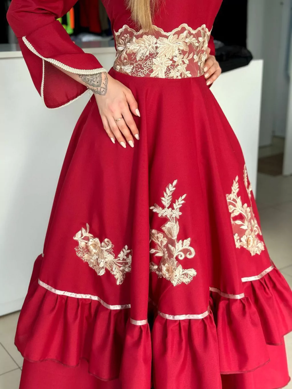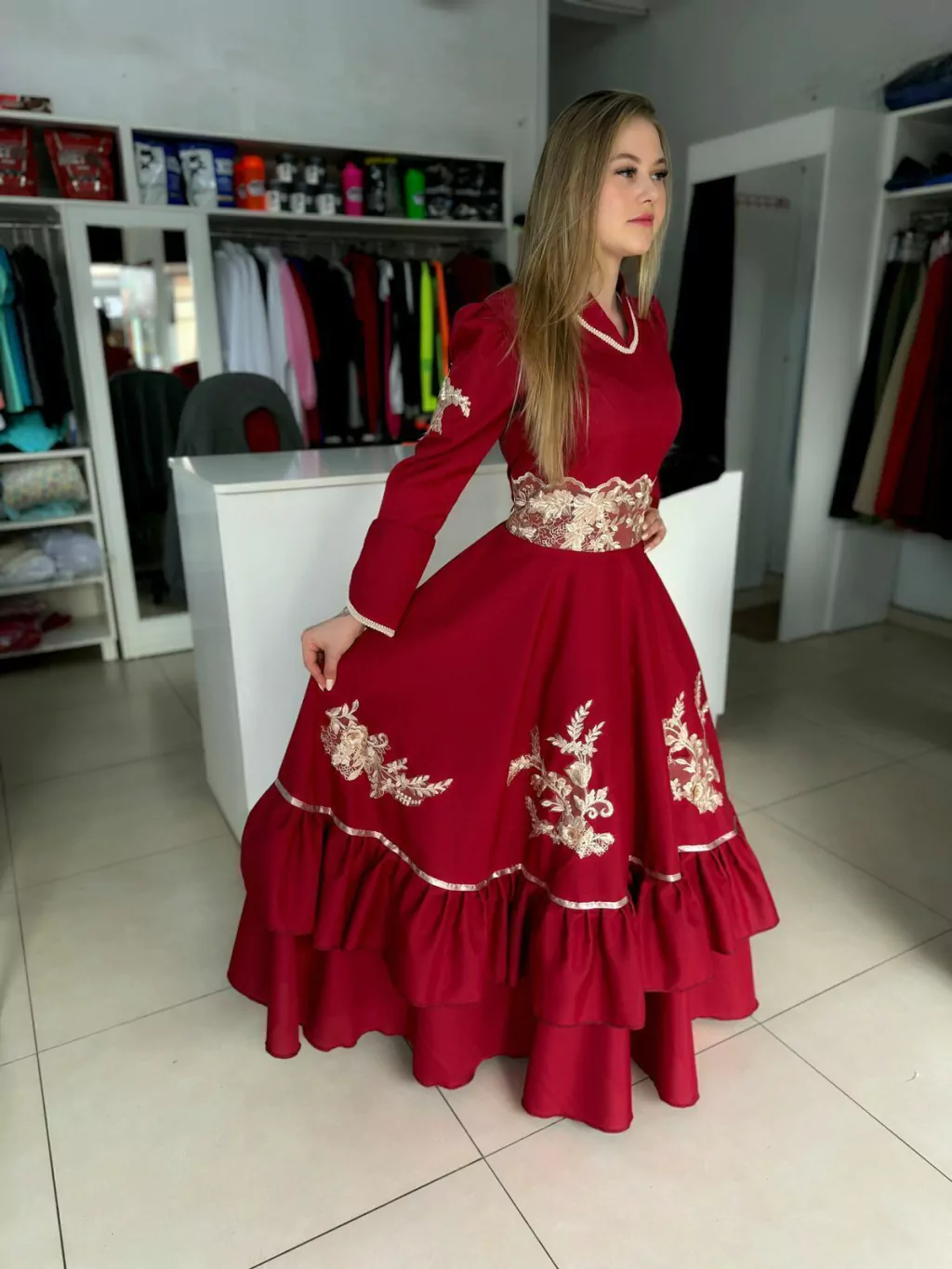 Vestido exclusivo em oxford bordô com detalhes em renda brilhosa.