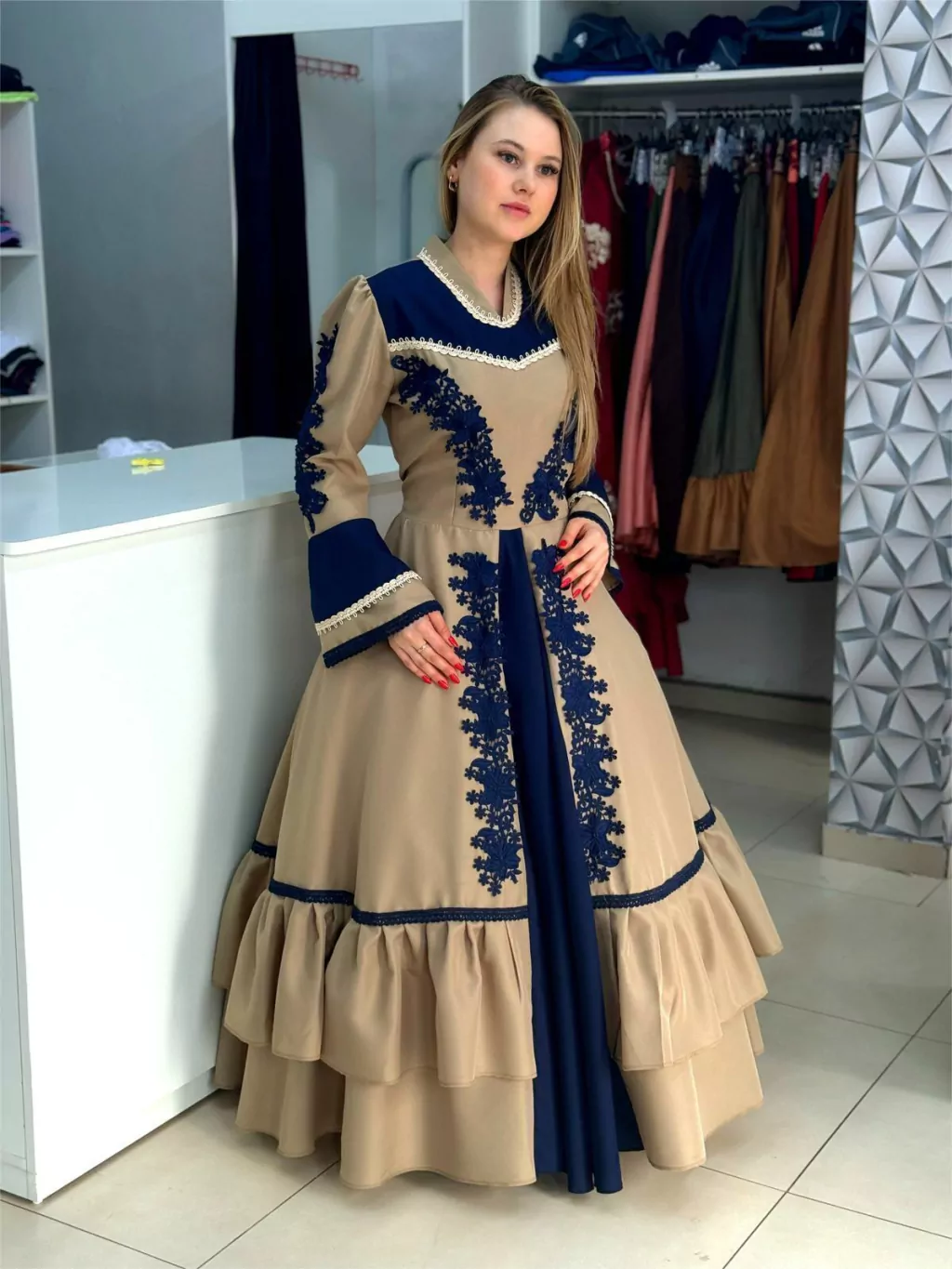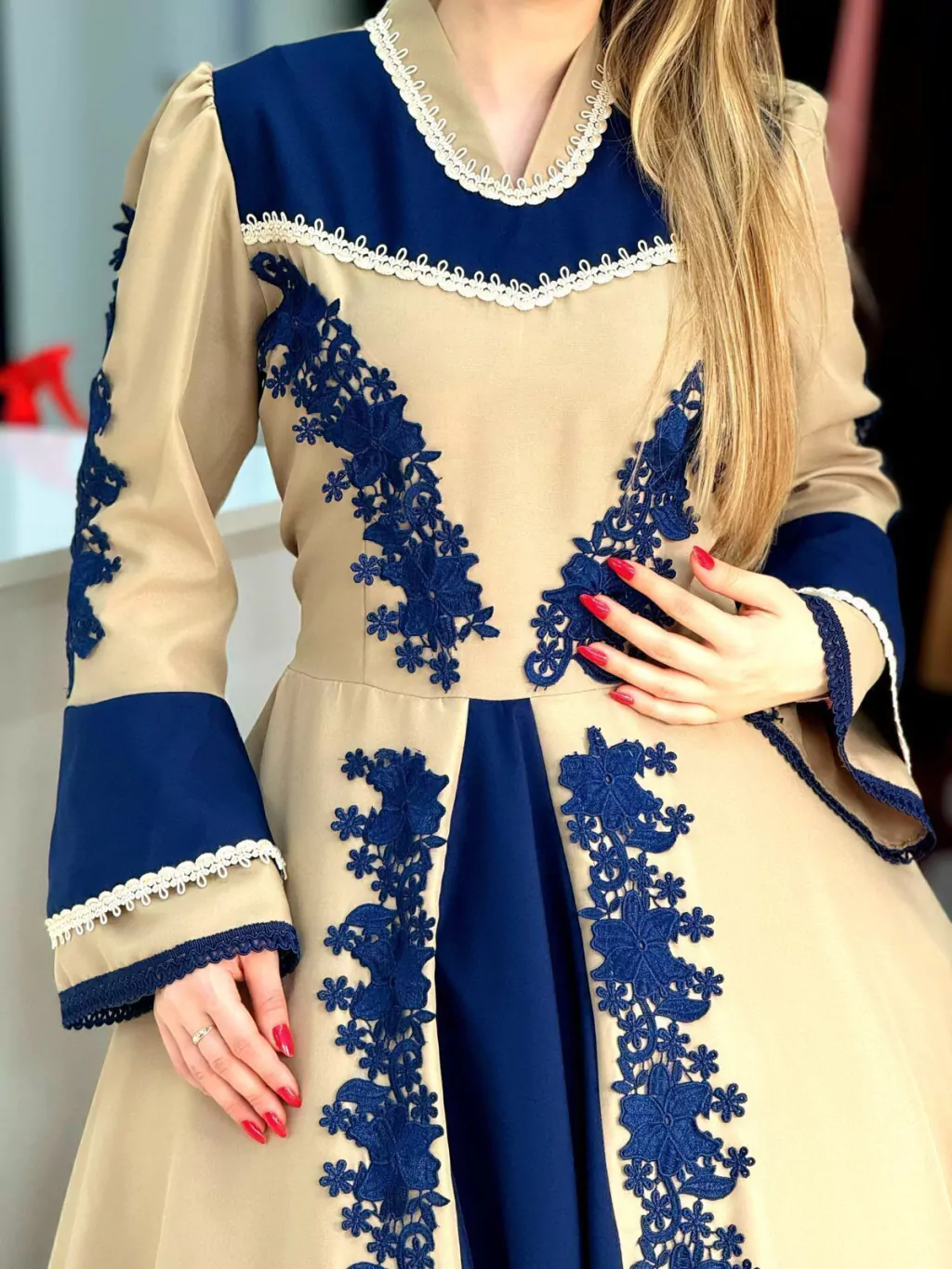 Vestido de prenda exclusivo confeccionado em oxfod bege com detalhes em renda marinho.