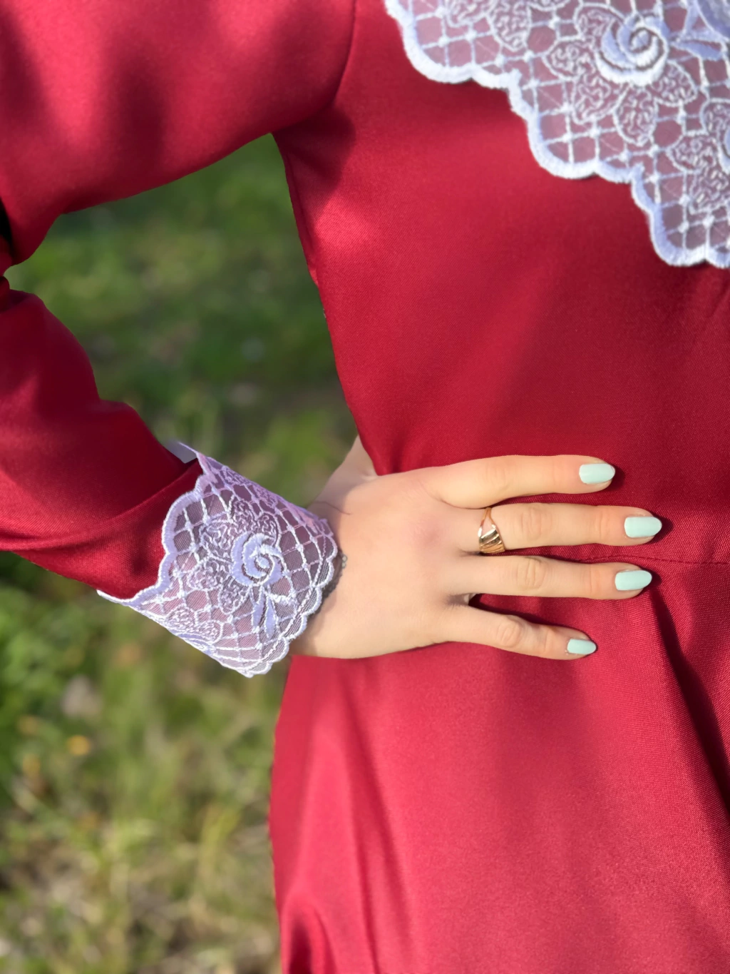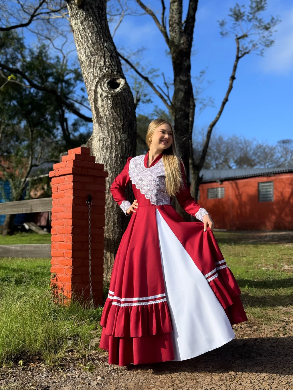 Saia confeccionada em Oxford com duas cores, detalhes em renda e babado.
