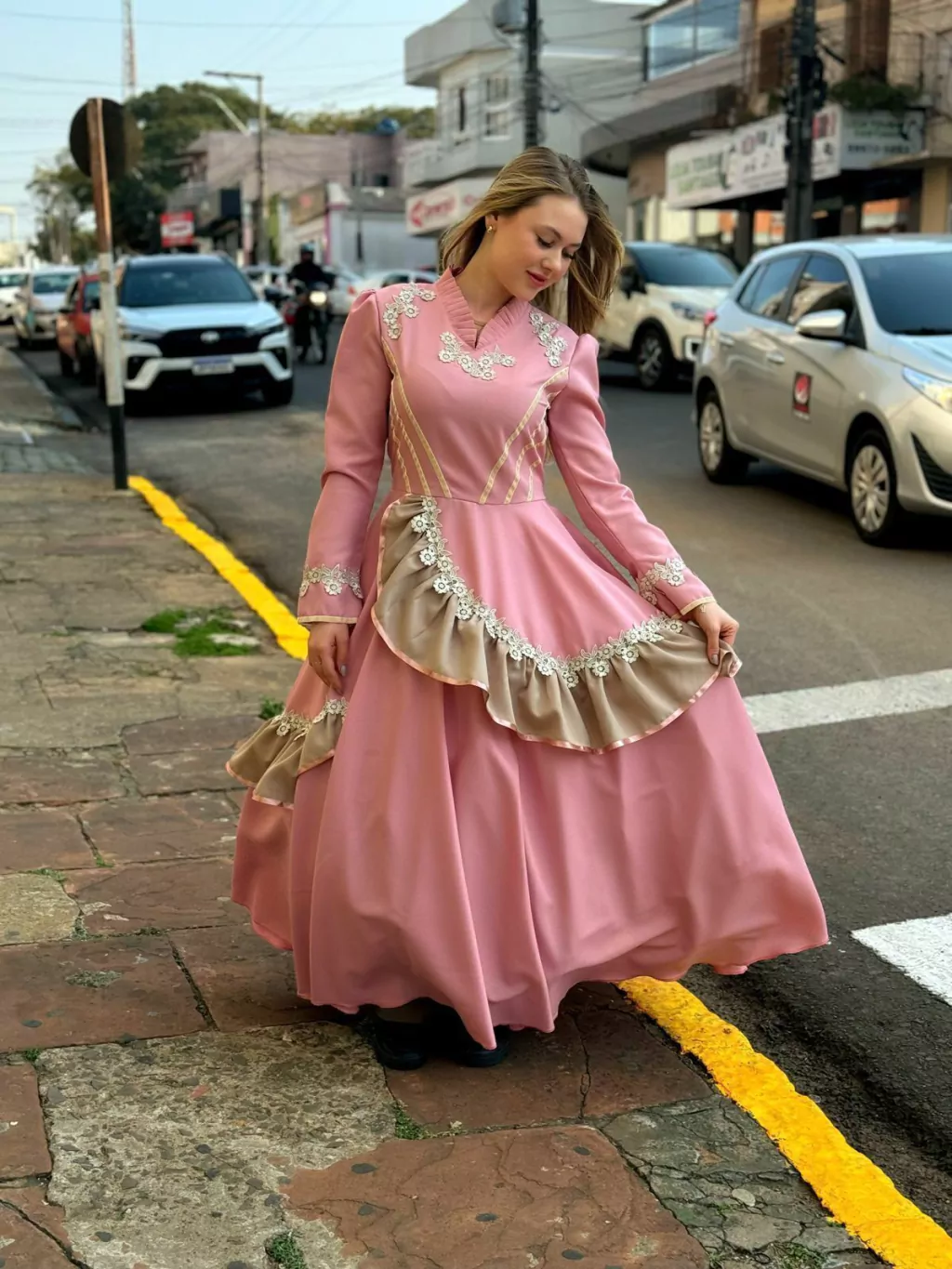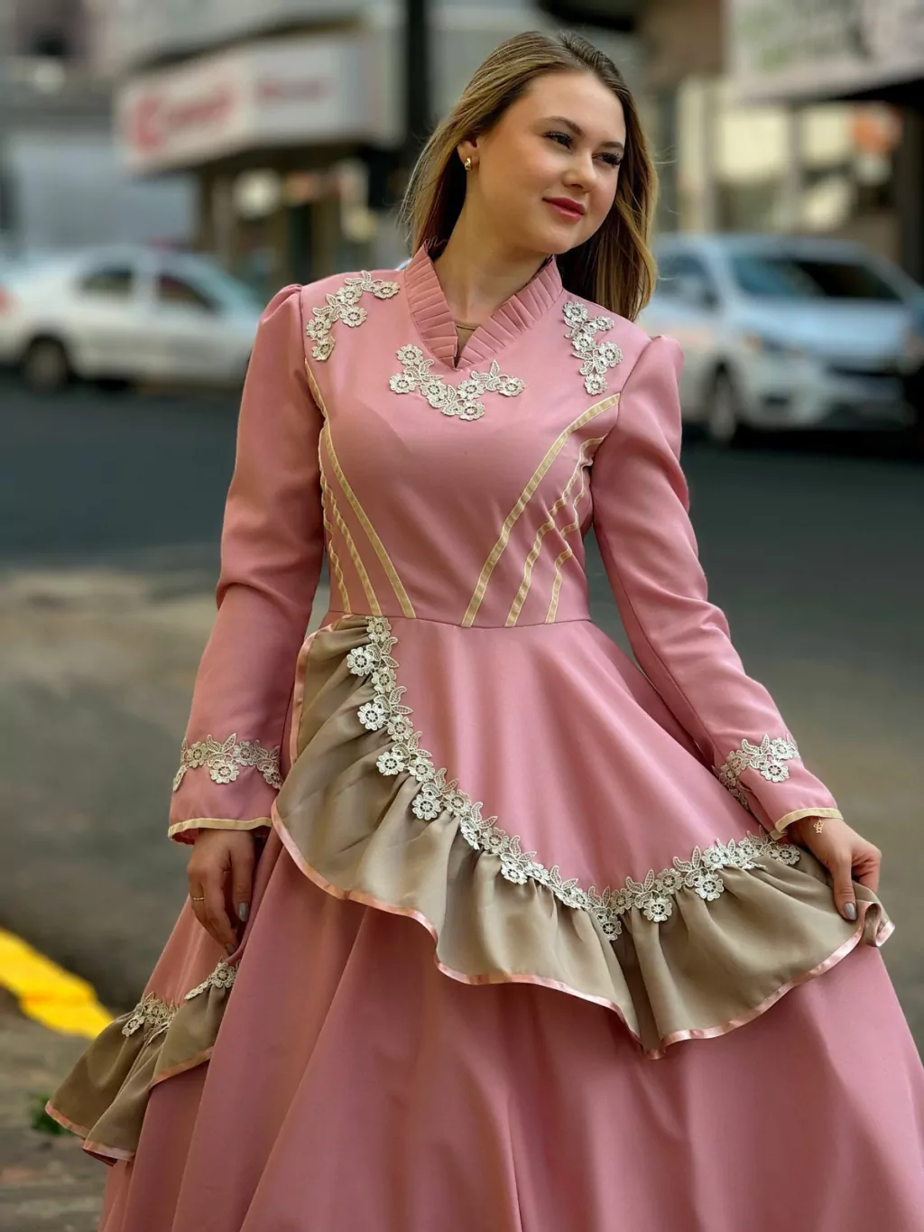 Vestido de prenda em oxford rose com detalhes em renda e fitas de veludos bege.