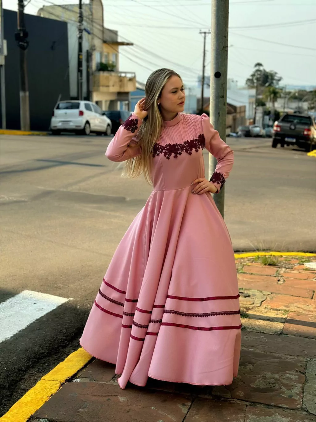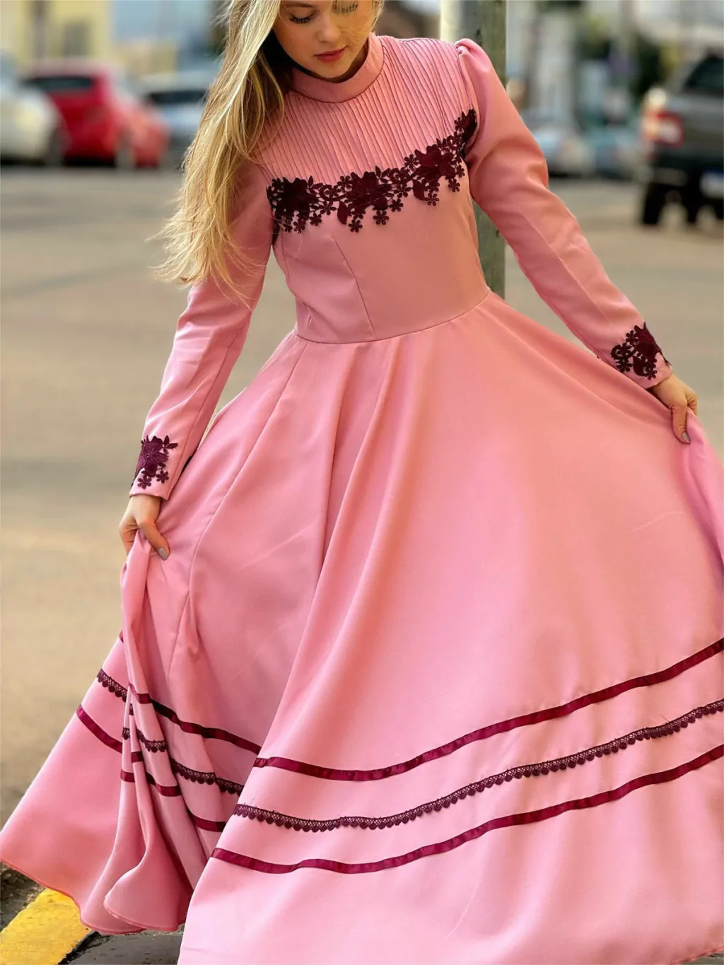 Vestido de prenda exclusivo em oxford em tom rose com detalhes em renda bordô.